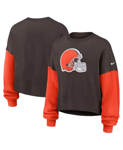 Stay comfy in fashionable Cleveland Browns apparel with this Oversized Color-Block Pullover Sweatshirt by Nike. It features dropped shoulders and scrunched sleeves for a trendy look and relaxed fit. Fleece fabric and brushedFrench terry lining provide exceptional warmth and a luxuriously soft feel, making this Cleveland Browns sweatshirt perfect for cooler game days or casual outings. Brand: Nike Brushed French terry lining adds softness and cozy warmth Crew neck Dolman sleeves have a wide armhole opening Dropped shoulder seams provide ease of movement Elongated rib-knit hem Extended arm length tapers at the cuffs for a scrunched, baggy look Fleece fabric has a midweight feel (280gsm) High hip length (Measures approx. 22) Imported Long sleeve Machine wash, tumble dry low Material: 73% Cotton (BCI)/18% Recycled Polyester/9% Organic Cotton Officially licensed Oversized Fit: Intentionally designed with wider and longer proportions for a spacious feel and a laidback look. For a less relaxed fit, consider sizing down. Pullover Screen printed team logo