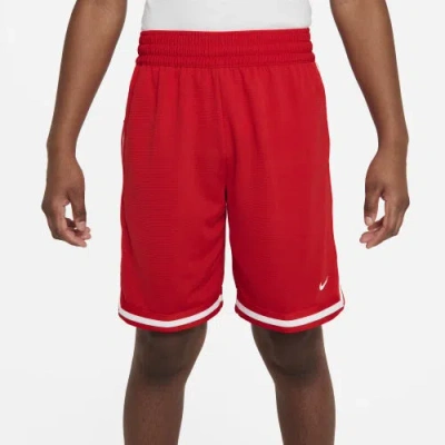 From layup drills at home to pickup games in the park with your friends, you can do it all in these roomy basketball shorts. Powered by comfortable knit fabric that pulls sweat away from your skin, they help you stay cool and focused through every dribble, drive and dagger shot. Plus, a zippered pocket helps keep small essentials secure as you run down the court to make your next slam dunk. Benefits: Nike Dri-FIT technology moves sweat away from your skin for quicker evaporation, helping you stay dry and comfortable. Lightweight knit fabric is soft and flexible, helping you comfortably move in any direction. Elastic waistband with internal drawcord helps you find your perfect fit. Zippered utility pocket provides secure storage for snacks, keys or other essential items. Product Details: Body/Pocket bags: 100% polyester. Side pockets. Striped hem tape. Machine wash. Imported. Style: FJ6802; Color: University Red/White; Size: XS; Gender: Male; Age Group: Kids | Nike Dri-FIT DNA Big Kids' (Boys') Basketball Shorts in Red, Size: XS | FJ6802-657