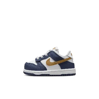 Start your little one's sneaker collection off with an icon. Designed for basketball but adopted by skaters, the Nike Dunk Low helped define sneakerhead culture. With plush ankle padding and durable rubber traction, this '80s icon is an easy win for playtime and beyond. Made to Last:Real and synthetic leathers are durable and bring a classic feel. Heritage Look:Collar and tongue pair with perforations on the toe area to give these sneakers an iconic look rooted in the original Dunk. All-Day Traction:Full-length rubber outsole provides durable traction and features a pattern similar to the original. Product Details:Classic laces. Cupsole construction. Style: FB9107; Color: White/Midnight Navy/Wheat; Size: 8C; Gender: Male; Age Group: Toddler | Nike Dunk Low Baby/Toddler Shoes in White, Size: 8C | FB9107-111
