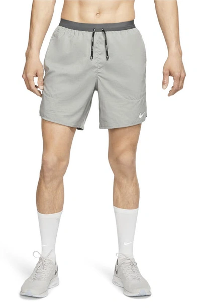 SOFT, BREATHABLE SUPPORT. BUILT TO MOVE. The Nike Flex Stride Shorts are updated with an all-new woven fabric and enhanced breathability in high-sweat areas. Their soft brief liner provides secure support where you need it. This product is made with at least 50% recycled polyester fibers. Lightweight and Soft: A lightweight design made of woven fabric helps keep you comfortable. At the back, enhanced ventilation keeps you cool where you need it most. Easy Storage: At the back, a zippered pocket helps keep your electronic device secure. Side pockets and a drop-in pocket on the brief liner offer up space for small items. Distraction-Free Support: An updated narrow waistband offers up distraction-free support. Its dual-function drawcord can be worn internally or externally. More Benefits: Nike Flex fabric stretches with your body. Dri-FIT technology helps you stay dry and comfortable. Product Details: Standard fit for a relaxed, easy feel. Knit liner. Reflective elements at the side hems and reflective Swoosh at the left leg. Body: 100% polyester; Panels: 94% polyester, 6% spandex; Waistband: 66% nylon, 34% spandex; Lining: 89% recycled polyester, 11% spandex. Machine wash. Imported. Not intended for use as Personal Protective Equipment (PPE). Style: CJ5459; Color: Iron Grey/Heather; Size: M; Gender: Male; Age Group: Adult | Nike Flex Stride Men's 7" Brief Running Shorts in Grey, Size: Medium | CJ5459-068