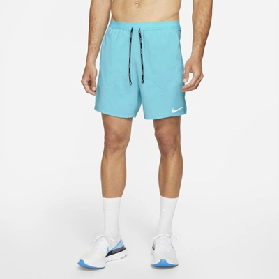 SOFT, BREATHABLE SUPPORT. BUILT TO MOVE. The Nike Flex Stride Shorts get updated with an all-new woven fabric and enhanced breathability in high-sweat areas. Their 2-in-1 design has a soft liner for support where you need it. This product is made with at least 50% recycled polyester fabric. Lightweight and Soft A lightweight design made of recycled woven fabric and stretch helps keep you comfortable and focused. At the back, enhanced ventilation keeps you cool where you need it most. Multiple Storage Options A back zippered pocket helps keep your electronic device secure. Side pockets and a drop-in pocket on the liner offer up space for small items. Distraction-Free Support An updated narrow waistband limits distractions. Its dual-function drawcord can be worn internally or externally. More Benefits Nike Flex fabric stretches with your body. Dri-FIT technology helps you stay dry and comfortable. 2-in-1 lining is molded at the gusset for an ideal fit. Product Details Standard fit for a relaxed, easy feel Reflective Swoosh at the left leg and reflective elements at the side hems 7" inseam with breathable knit liner Reflective bars Heathered colors: Shorts: 100% polyester. Panel: 94% polyester/6% spandex. Waistband: 66% nylon, 34% spandex. Tight/Tight Center Front Lining: 89% recycled polyester/11% spandex. Solid colors: Shorts: 100% recycled polyester. Panel: 94% polyester/6% spandex. Waistband: 66% nylon, 34% spandex. Tight/Tight Center Front Lining: 89% recycled polyester/11% spandex. Material percentages may vary depending on factory. Check label for actual content. Machine wash Imported Not intended for use as Personal Protective Equipment Style: CJ5471; Color: Chlorine Blue/Chlorine Blue; Gender: Male; Age Group: Adult