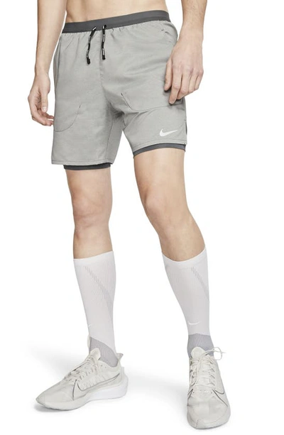 SOFT, BREATHABLE SUPPORT. BUILT TO MOVE. The Nike Flex Stride Shorts get updated with an all-new woven fabric and enhanced breathability in high-sweat areas. Their 2-in-1 design has a soft liner for support where you need it. This product is made with at least 50% recycled polyester fibers. Lightweight and Soft: A lightweight design made of woven fabric and stretch helps keep you comfortable and focused. At the back, enhanced ventilation keeps you cool where you need it most. Multiple Storage Options: A back zippered pocket helps keep your electronic device secure. Side pockets and a drop-in pocket on the liner offer up space for small items. Distraction-Free Support: An updated narrow waistband limits distractions. Its dual-function drawcord can be worn internally or externally. More Benefits: Dri-FIT technology helps you stay dry and comfortable. Product Details: Standard fit for a relaxed, easy feel. Reflective Swoosh at the left leg and reflective elements at the side hems. 7" inseam with breathable knit liner. Reflective bars. Shorts: 100% polyester. Panel: 94% polyester/6% spandex. Waistband: 66% nylon/34% spandex. Tight: 89% polyester/11% spandex. Tight front center lining: 89% polyester/11% spandex. Machine wash. Imported. Not intended for use as Personal Protective Equipment (PPE). Style: CJ5471; Color: Iron Grey/Iron Grey/Heather; Size: 2XL; Gender: Male; Age Group: Adult | Nike Flex Stride Men's 7" 2-In-1 Running Shorts in Grey, Size: 2XL | CJ5471-068