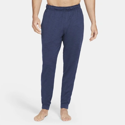 MINDFUL COVERAGE ON OR OFF THE MAT. The Nike Yoga Dri-FIT Pants are a soft, light layer that keeps you comfortably covered during practice and beyond. They're made from at least 75% recycled polyester fibers with sweat-wicking power that helps you stay dry from your first stretch to your last pose. Dri-FIT Comfort: Soft, light fabric with Dri-FIT technology moves sweat from your skin to help you stay dry and comfortable. Minimal Distractions: The tapered design cuts down on excess material at your lower leg so you can focus on your posture. The elastic waist with drawcord helps keep the pants in place as you move. Product Details: Standard fit for a relaxed, easy feel. Pockets. 92% polyester/8% spandex. Machine wash. Imported. Style: CZ2208; Color: Midnight Navy/Dark Obsidian; Size: 4XL Tall; Gender: Male; Age Group: Adult | Nike Yoga Dri-FIT Men's Pants in Blue, Size: 4XL Tall | CZ2208-410