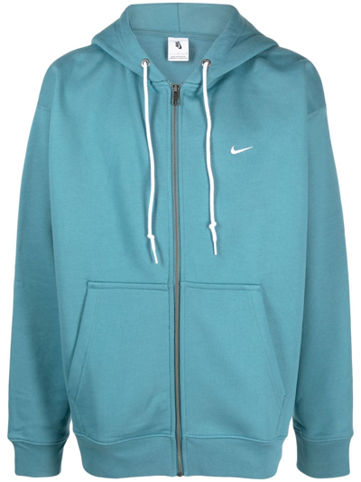 A true classic, our Solo Swoosh full-zip hoodie is made with supersoft fleece for smooth, easy comfort. The simplicity of the design lets you pair it up or down for clean, casual daily wear. Benefits: The Solo Swoosh collection nods to the sports and fashion of the 1990s. and our own In an era of wild and audacious design, the simplicity of the Swoosh was a breath of fresh Air. French terry fleece is brushed for smooth comfort against your skin. Roomy fit gives you some extra space through your chest, body and hips for easy comfort and layering. Full-zip design with sturdy metal zipper lets you adjust your style and coverage with ease. Product Details: Hood with drawcord. Ribbed cuffs and hem. Split Kangaroo pocket. 84-85% cotton/15-16% polyester. Material percentages may vary. Check label for actual content. Machine wash. Imported. Style: DR0403; Color: Noise Aqua/White; Size: 3XL; Gender: Male; Age Group: Adult | Nike Solo Swoosh Men's Full-Zip Hoodie in Blue, Size: 3XL | DR0403-440