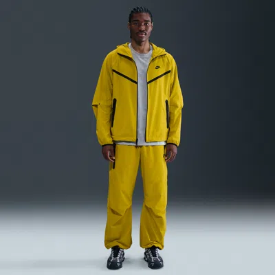 Crafted with stretchy woven material, these Nike Tech pants offer you ease of movement and adjustability. The wide-leg cut is paired with bungee locks at the ankles that let you switch up the fit. Benefits:Lightweight fabric moves sweat away from your skin for quick evaporation, helping you stay dry and comfortable. Oversized fit offers plenty of space through the thighs and legs. Articulated knees are made with movement in mind, and add a distinct Nike Tech aesthetic. Stretchy elastic waistband with bungee drawcord provides a custom fit. [] Product Details:Nike Futura logo. Extralong taped Tech pocket. Hand pocket on the left. Body:94% nylon/6% spandex. Pocket Bags:100% polyester. Machine wash. Imported. Style: HM7158; Color: Bright Citron/Bright Citron/Black; Size: M; Gender: Male; Age Group: Adult | Nike Tech Men's Woven Oversized Pants in Yellow, Size: Medium | HM7158-726