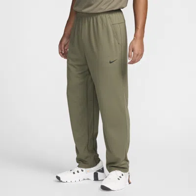 Designed for running, training and yoga, these pants are all about versatility. From beginning a new workout routine to pushing your limits in the gym, these lightweight knit pants keep everything simple and fresh. Fabric wicks away sweat, and the relaxed fit provides the comfort you need to help reach your goals. Benefits:Standard fit with straight leg design. Nike Dri-FIT helps move sweat away from the skin. Side pockets provide easy-to-reach storage. Elastic waistband and drawcord give a secure fit. Soft knit fabric is smooth and lightweight. Product Details:100% polyester. Machine wash. Imported. Style: FB7507; Color: Medium Olive/Black; Size: 4XL Tall; Gender: Male; Age Group: Adult | Nike Totality Men's Dri-FIT Open Hem Versatile Pants in Green, Size: 4XL Tall | FB7507-222
