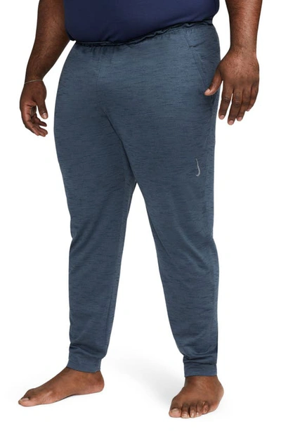 MINDFUL COVERAGE ON OR OFF THE MAT. The Nike Yoga Dri-FIT Pants are a soft, light layer that keeps you comfortably covered during practice and beyond. They're made from at least 75% recycled polyester fibers with sweat-wicking power that helps you stay dry from your first stretch to your last pose. Dri-FIT Comfort: Soft, light fabric with Dri-FIT technology moves sweat from your skin to help you stay dry and comfortable. Minimal Distractions: The tapered design cuts down on excess material at your lower leg so you can focus on your posture. The elastic waist with drawcord helps keep the pants in place as you move. Product Details: Standard fit for a relaxed, easy feel. Pockets. 92% polyester/8% spandex. Machine wash. Imported. Style: CZ2208; Color: Diffused Blue/Obsidian; Size: M; Gender: Male; Age Group: Adult | Nike Yoga Dri-FIT Men's Pants in Blue, Size: Medium | CZ2208-491