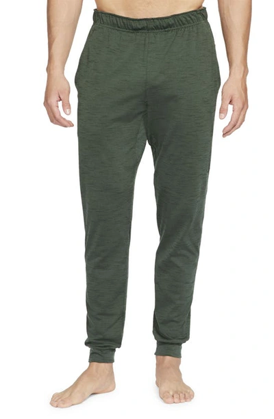 Lightweight, sweat-wicking fabric keeps you comfortable so you can focus on your poses in stretchy yoga pants cut with a tapered fit that stays out of your way. They're made with at least 75% recycled polyester and sport convenient hand pockets to stow essentials for post-stretch recovery or just lazy afternoons. 19 1/2" inseam; 9 1/2" leg opening; 11 1/2" front rise; 13 1/2" back rise (size Medium) Elastic waist with internal drawcord Front slant pockets Banded cuffs Dri-FIT moisture-wicking technology 92% polyester, 8% spandex Machine wash, tumble dry Men's Clothing