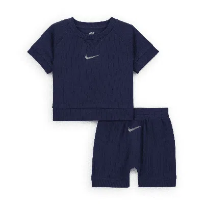 Get ready to help littles get set for fun with this 2-piece set, made of soft cotton rib knit fabric that stretches for freedom of movement. The tee has a tagless crewneck for a comfy feel and venting at the hem adds extra breathability. The matching shorts have a comfy stretch waistband and ribbed cuffs to provide a secure fit as they move. Benefits:Both pieces can be worn separately with other pieces in your child's wardrobe. Product Details:95% Organic Cotton, 5% Spandex. Machine Wash. Imported. Style: 56L740; Color: Midnight Navy; Size: 9M; Gender: Male; Age Group: Toddler | Nike ReadySet Baby Shorts Set in Blue, Size: 9M | 56L740-U90