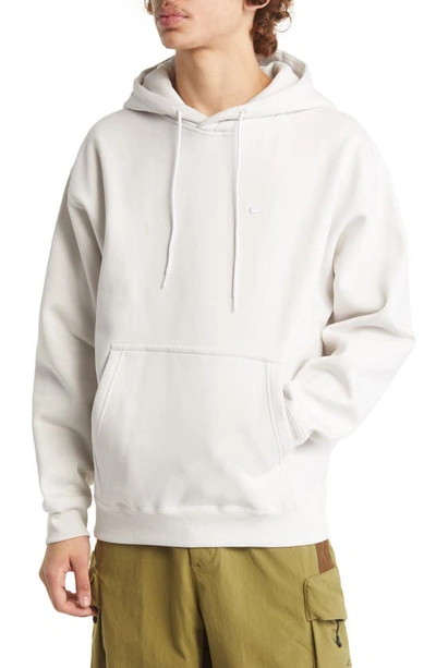 ESSENTIAL PULLOVER. Premium fleece fabric and a laid-back design highlight the Solo Swoosh Hoodie. Part of the Essentials collection, this piece uses a soft feel with a loose fit for all-day wear. Benefits: Brushed-back fabric delivers soft warmth. A hood with a drawcord lets you adjust your coverage. Front kangaroo pocket doubles as a hand warmer and storage. Ribbed cuffs help seal in warmth. Product Details: Loose fit for a roomy feel. Embroidered Swoosh. 84-85% cotton/15-16% polyester. Materials may vary. Check label for actual content. Machine wash. Imported. Style: CV0552; Color: Phantom/White; Size: 4XL; Gender: Male; Age Group: Adult | Nike Solo Swoosh Men's Fleece Hoodie in Grey, Size: 4XL | CV0552-030