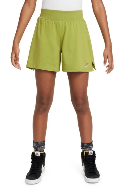 Made with our extra soft jersey fabric, these roomy shorts have a relaxed cut that's perfect for all your everyday adventures. A wide, stretchy waistband helps provide a stay-put fit while side vents give you a little extra room so you can run, jump and play with ease. Product Details: Body: 100% cotton. Rib: 97% cotton/3% spandex. Machine wash. Imported. Style: FN8593; Color: Pear/Olive Aura; Size: S; Gender: Female; Age Group: Kids | Nike Sportswear Big Kids' (Girls') Shorts in Green, Size: Small | FN8593-377