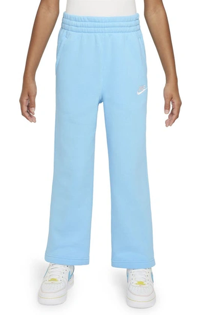 Run through chilly days in these relaxed, wide-leg pants that give you the space you need to feel ready to play. Smooth on the outside, brushed soft on the inside, this lightweight fleece is an easy layer when you want a little extra warmth. Part of our Club Fleece collection, these wildly comfortable sweats set you up with a classic Nike look you can mix and match with your favorite Nike tops and sneakers. Benefits: We evolved our size range to focus on fit, not gender, to let every kid play their way. Angled pockets make it easy for you to store your stuff and get back to playing. Tighten up the elastic waistband on the fly with the quick-tie drawcord. Product Details: Body: 80% cotton/20% polyester. Pocket bags: 100% cotton. 3-channel waistband. Embroidered Futura logo. Machine wash. Imported. Style: FD2927; Color: Aquarius Blue/Aquarius Blue/White; Size: XL; Gender: Female; Age Group: Kids | Nike Sportswear Club Fleece Big Kids' (Girls') Wide-Leg Pants in Blue, Size: XL | FD2927-407