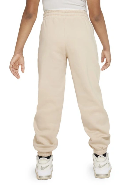 Extra room through the legs gives these oversized pants a relaxed, oh-so-cozy feel. Smooth on the outside, brushed soft on the inside, this lightweight fleece is an easy layer when you want a little extra warmth. So whether you're running circles around your friends at recess or running late to practice, these sweats give you the space you need to feel comfy, relaxed and ready for whatever comes next. Benefits: Designed for every shape and size, this new improved fit is for all kids. Angled pockets make it easy for you to store your stuff and get back to playing. Tighten up the waist on the fly with the quick-tie drawcord. Product Details: Body: 80% cotton/20% polyester. Pocket bags: 100% cotton. 3-channel waistband. Embroidered Futura logo. Machine wash. Imported. Style: FD2933; Color: Sanddrift/Sanddrift/White; Size: L; Gender: Female; Age Group: Kids | Nike Sportswear Club Fleece Big Kids' (Girls') Loose Pants in Brown, Size: Large | FD2933-126