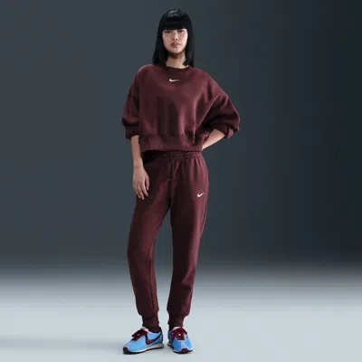 Rise up and transform your wardrobe with strong cozy vibes. Made with midweight brushed fleece that feels extra soft on the inside and smooth on the outside, these sweats help you stay cozy while offering a structured shape. A tapered fit finishes with a cinch at the ankles that helps you show off your favorite kicks. Benefits:Pockets provide quick storage for keys, phone and cold hands. Tighten up the elastic waistband on the fly with the quick-tie drawcord. [] Product Details:80% cotton/20% polyester. Embroidered Swoosh logo on left leg. Machine wash. Imported. Style: FZ7626; Color: Burgundy Crush/Sail; Size: XS; Gender: Female; Age Group: Adult | Nike Sportswear Phoenix Fleece Women's Mid-Rise Sweatpants in Red, Size: XS | FZ7626-652