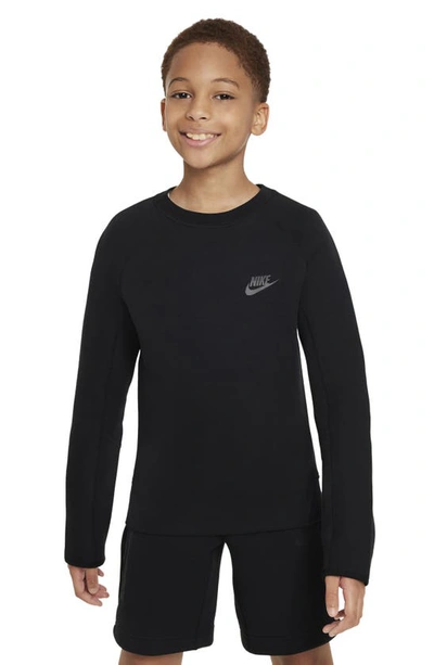 Allow us to reintroduce you to Tech Fleece, one of our favorite ways to warm up in cold conditions. Our premium, lightweight fleeceâsmooth both inside and outâgives you plenty of warmth without adding bulk. Always a good idea, this versatile layering piece feels as comfortable under a rain jacket as it does when you wear it over a tee. Benefits: We evolved our size range to focus on fit, not gender, to let every kid play their way. Cuffs are finished with a smooth, stretchy binding for a clean look and snug feel. Ribbing at the hem and collar helps hold in the heat without restricting how you move. Product Details: 53% cotton/47% polyester. Printed Futura logo. Machine wash. Imported. Style: FD3293; Color: Black/Black/Black; Size: XL; Gender: Male; Age Group: Kids | Nike Sportswear Tech Fleece Big Kids' (Boys') Sweatshirt in Black, Size: XL | FD3293-010
