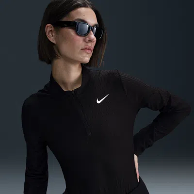 Nike Swift Dri-FIT Ultraviolet 1/4-Zip Running Top - Women's Workout : Black/Reflective Silver : ; ; Using insights from runners like you, we prioritized functionality to refresh our Swift essentials. This lightweight Nike Swift Dri-fit Ultraviolet 1/4-zip Running Top has been designed to help reduce chafing. It's soft, sweat-wicking and helps block out UV rays so you can focus on your miles, and nothing else. Nike Dri-FIT technology moves sweat away from your skin for quicker evaporation, helping you stay dry and comfortable. The top is tapered around the waist so that layering with other pieces is easier. A curved hem helps keep you covered through your stride. Plus, thumbholes let you extend your coverage and help hold the sleeves in place. Unhindered movement, modified raglan sleeves are designed to help reduce underarm chafing and allow for a wider range of motion. ; Regular fit and pull-on style. ; Crew neckline and long sleeves. ; Watch windows on either sleeve make it easy to check time. ; Zippered pocket on the left side seam fits items like earbuds, a key or a card. ; Reflective Swoosh logo on left chest. ; Reflective graphics on sleeves and back. ; Not intended for use as Personal Protective Equipment (PPE). This product provides UVA and UVB protection from the sun only in the areas covered by the garment. To protect exposed areas, the use of good quality sunscreen is recommended. ; 88% polyester, 12% elastane. ; Machine washable. ; Imported. | Nike Swift Dri-FIT Ultraviolet 1/4-Zip Running Top Women's Workout Black/Reflective Silver : LG, Elastane/Polyester