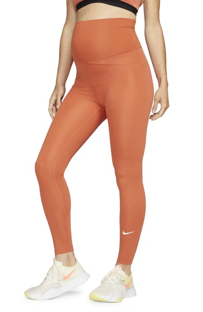 SUPPORTIVE FLEXIBILITY THAT GROWS WITH YOU. The light and breathable Nike One (M) Leggings are comfortable enough to wear while you work out or anytime. With zonal fabric designed to grow with youâbefore, during, and after pregnancyâthey cover and support your entire bump. Fold down the waistband when you're ready to relax. This product is made with at least 75% recycled polyester fibers. Benefits: Soft fabric with minimal seams covers and supports your baby bump. The waistband has zonal fabric to give both extra support and increased freedom. The fit grows with you pre- and post-pregnancy with engineered shaping and construction. Dri-FIT technology helps keep you dry and comfortable. Product Details: Tight fit for a body-hugging feel. Foldable waistband. Body: 78-79% polyester/21-22% spandex. Waistband: 88% polyester/12% spandex. Waist Lining: 88% polyester/12% spandex. Material percentages may vary. Check label for actual content. Machine wash. Imported. Style: DH1587; Color: Light Sienna/White; Size: S Tall; Gender: Female; Age Group: Adult | Nike One (M) Women's High-Waisted Leggings (Maternity) in Orange, Size: S Tall | DH1587-812