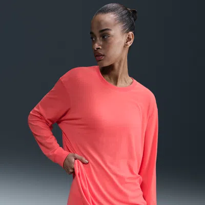 Up for a workout or down to chill, this Nike One Relaxed top is ready for whatever you are. Slightly textured, incredibly lightweight jersey fabric dries quickly and drapes you in comfort that goes with any activity. A loose, roomy fit and extended length help keep you covered and cozy from your morning stroll to your evening wind-down—and at all the stops in between. Nike One for All:For years, Nike One has been a partner to you on your fitness journey, but we recognize that fitness doesn't look—or feel—the same for everyone. Looking for something more tailored and polished? Check out Nike One Fitted cropped tops. Or try a Nike One Classic top for an easy fit that's still sleek, available in a variety of lengths to meet your needs. All-Day Comfort and Versatility:A ribbed neckline and cuffs enhance the favorite-tee feeling and help keep the top in place while you move. A longer length is easy to tie up and customize for looks that go with everything you do in a day. More Benefits:Nike Dri-FIT technology moves sweat away from your skin for quicker evaporation, helping you stay dry and comfortable. Curved hem helps keep you covered as you move. Product Details:81% polyester/13% cotton/6% spandex. Machine wash. Imported. Reflective logo at center back. Not intended for use as Personal Protective Equipment (PPE). Style: FN2817; Color: Magic Ember/Black; Size: L; Gender: Female; Age Group: Adult | Nike One Relaxed Women's Dri-FIT Long-Sleeve Top in Orange, Size: Large | FN2817-814