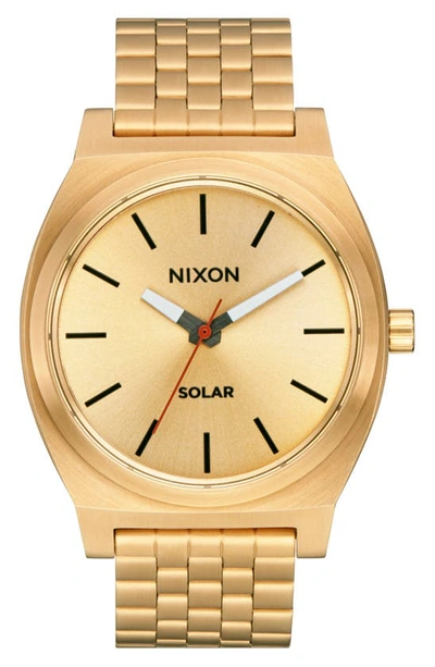 The Time Teller has been upgraded to solar status, gathering and storing power from both interior lighting and direct sunlight to keep you stylishly on time. A sleek, numberless dial elevates the streamlined design and a matching bracelet adds a dash of classic sophistication.