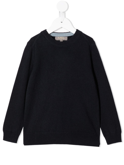 Navy/heather blue organic cashmere organic cashmere sweatshirt from N.PEAL KIDS featuring crew neck, ribbed detailing, long sleeves and straight hem. POSITIVELY CONSCIOUS: This Planet Conscious product is made from at least 50% organic materials, which helps you support organic farming practices such as the restricted use of synthetic chemicals and genetically modified seeds, improved soil fertility and better livestock management..
