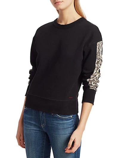 Street-style pullover with edgy snakeskin trim down the sleeves. Crewneck. Long sleeves. Dropped shoulder. Pullover style. Distressed detailing. Cotton terry. Machine wash. Made in USA. SIZE & FIT. About 23" from shoulder to hem. Model shown is 5'10" (177cm) wearing US size Small.