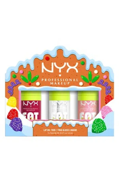 FAT OIL LIP DRIP TRIO KIT. Benefits: Get your lips holiday-ready with the NYX Professional Makeup Holiday Fat Oil Trio Kit This limited-edition set includes three high-shine shades of the beloved Fat Oil Lip Drip.. Delivering intense hydration, a glossy finish, and a non-sticky feel that lasts up to 12 hours. Infused with nourishing oils like raspberry, cloudberry, and squalane.. The formula deeply hydrates and conditions, leaving lips soft, smooth, and irresistibly shiny. The FAT applicator glides on effortlessly, providing a sheer wash of color with a dazzling finish thats perfect for any occasion.. whether its a cozy daytime look or a bold, glossy statement for a holiday party. Packaged in festive, gift-ready packaging, this trio is ideal for gifting or treating yourself to a touch of seasonal luxury.. Celebrate the holidays with lips that shine as bright as the season, all while staying vegan and cruelty-free.. Includes: Fat Oil Lip Drip Lip Oil Holi-Bae. Fat Oil Lip Drip Lip Oil My Main. Fat Oil Lip Drip Lip Oil Newsfeed. :