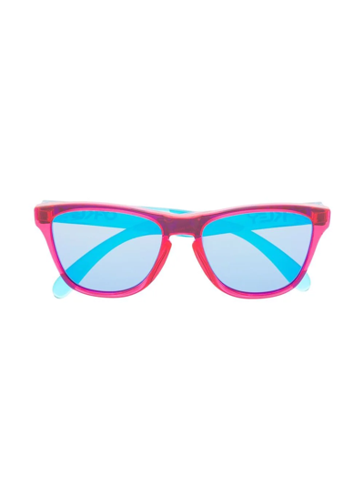Pink/blue two-tone squared sunglasses from OAKLEY featuring two-tone design, logo plaque at the arm, square frame, blue tinted lenses, straight arms and curved tips. These glasses come with a protective case..