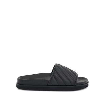 OFF-WHITE - Cloud Diagonal Slider in Black - This sophisticated and stylish shoe is designed for sophistication and comfort. The durable leather upper and contoured interior provide unbeatable cushioning and stability. Plus, its lightweight design makes it perfect for everyday wear! Composition: Outer: 100% Calf LeatherLining: 100% LeatherSole: 100% RubberSignature Diag-stripe quiltingDebossed logo to the sideRound open toeMoulded footbedBranded footbedFlat rubber soleSlip-on style SKU: OWIT005F23LEA0011010