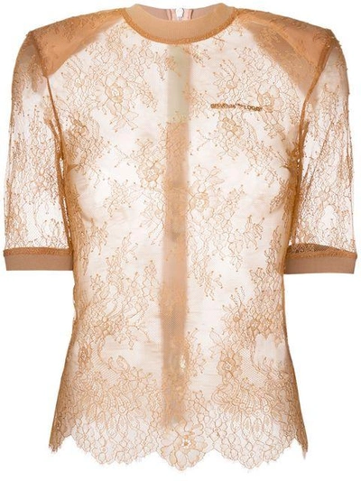 Nude silk blend lace detailed top from Off-White featuring a round neck, panelled 3/4 sleeves and a transparent design.