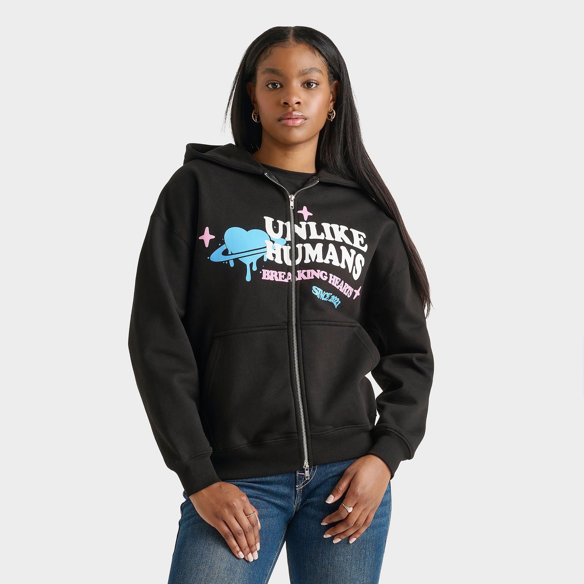 Size & Fit Roomy, relaxed fit Dropped shoulder design Product Features Supersoft, leisure lifestyle hooded sweatshirt with printed Breaking Heatrts Since 2021 UH graphics across front Supersoft cotton construction with brushed interior Spacious 2-panel hood with two-way full-length zipper closure for optional styling Bisected kangaroo pocket for convenient storage of essential items and colds hands Ribbed hem and cuffs for a stay-put fit that seals in warmth 85% Cotton and 15% Polyester Machine wash The Unlike Humans Heartbreaker Full-Zip Hoodie is imported. Otherworldly originality and unparalleled comfort are at the core of this this Women's Unlike Humans Heartbreaker Full-Zip Hoodie. Crafted from a serenely soft cotton-poly blend, this plush cotton pullover sports a generously roomy fit and features a two-way full-length zipper and undeniably unique UH graphics on the front and back for an easygoing, euphoric look.