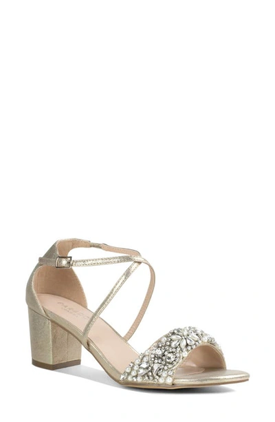 Faceted crystals and pearly beads shimmer and shine at the toe of a strappy metallic sandal lifted by a block heel.
