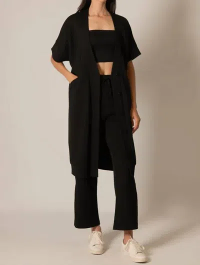 Throw this adorable cardigan over any cami or tank top.Featuring a relaxed fit and soft breathable fabric. Designed in a chic black. Long line cardigan has short sleeves. Comfortable length of 41 inches. Composed of 48% Modal, 48% Polyester, 4% Spandex. Button closure with covered buttons. Machine wash or hand wash gently, in cold or warm water, and hang to dry.