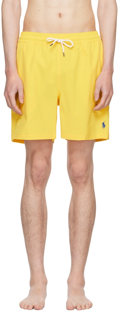 Polo Ralph Lauren's Traveler swim shorts feature a drawstring elasticized waistband, three pockets, and the brand's signature embroidered pony logo. Mesh lining completes this lightweight, comfortable style. Drawstring elasticized waistband Side slip pockets Back flap pocket 90% polyester/10% elastane Lining: 100% polyester Machine wash Imported SIZE & FIT Rise: about 10'' Inseam: about 5.75'' Model measurements: 6'2" tall, 31" waist Model is wearing a US size Medium ABOUT THE BRAND Synonymous with Americana style since 1967, Ralph Lauren started with one item-the necktie-under the name Polo. The house has since stood for the epitome of refined dressing for men. From collegiate sweaters and polos to evening-ready suiting and tailored coats, there's a timeless piece for every occasion. Men Luxury Coll - Polo Blue Label > Polo Ralph Lauren > Saks Fifth Avenue > Barneys. Polo Ralph Lauren. Color: Yellow Fin. Size: Large.
