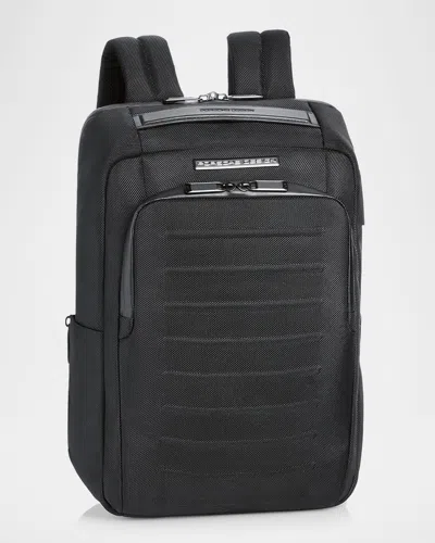 Made of waterrepellent textured nylon, leather, and polyester With its high functionality, extremely durable, lightweight material and smart details, this collection is specially developed for everyday dynamic use, both in an urban setting as well as for traveling. Inside, roomy compartments and functional pockets provide ample space and protection for devices and documents. Additional zipped compartments provide access to personal belongings. The textile lining shows the PD icon print. All the black hardware is a Porsche design unique design feature. Top handles with snap strap Detachable, adjustable shoulder strap Twoway zip top closure Exterior, one zip pouch, one zip pocket, back slipthrough slot Interior, one zip pocket, removable zip pouch Approx. 10"H x 18"W x 8.5"D Item Weight (Lbs.): 3.0 Lining: Polyester Wipe clean Imported