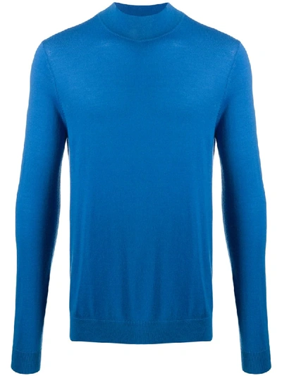 Blue merino mock neck jumper from Pringle Of Scotland featuring long sleeves, a ribbed hem and cuffs and a slim fit.