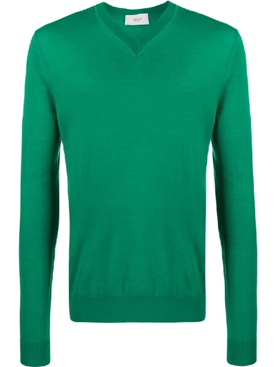 Green merino V-neck jumper from Pringle Of Scotland featuring long sleeves and a ribbed hem and cuffs.