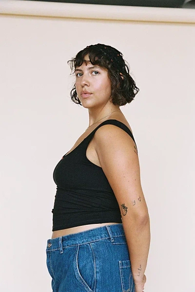 Our most flattering top yet. The Romantic Top features the same snatching fit as our best-selling Scoop Back Cami, with a square scoop neckline and a slightly scooped back. The straps are thick enough to be bra-friendly, yet supportive enough to wear comfortably without a bra-just like the original. The bust area is double lined with a curved contour seam for subtle shaping, while the waist gently tapers in to create a flattering silhouette. Finished at a mid length for easy styling with your favorite bottoms. Square Scoop Neckline Bra-friendly straps with built in support Double lined bust with contour seam Fitted Mid-length Made in LA Content + Care 95% GOTS Certified Organic Cotton 5% Spandex We recommend washing gently on cold and tumbling on low heat to dry. Steam as needed to get wrinkles out. Size + Fit This style is available in XS-3X and is meant to fit snug and secure. To find your best fit, please use our size chart. If you are between sizes and want a more relaxed fit, size up. Julianna is 5'4" and wears a size XS Libby is 5'5" and wears a size L Bella is 5'11" and wears a size 2X RAT BOI Romantic Tank Top in Onyx, Women's at Urban Outfitters