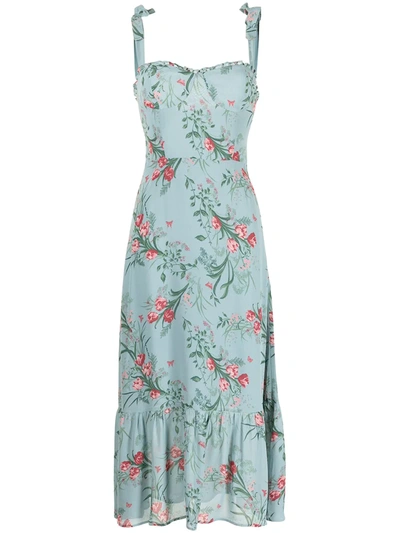 Dusty blue Nikita floral-print dress from REFORMATION featuring all-over floral print, sweetheart neck, sleeveless, tie-fastening straps, open back and mid-length. POSITIVELY CONSCIOUS: We’ve joined forces with ethical agency Good On You to give you the power to choose positively. This piece is from a brand that scores well on their key criteria..