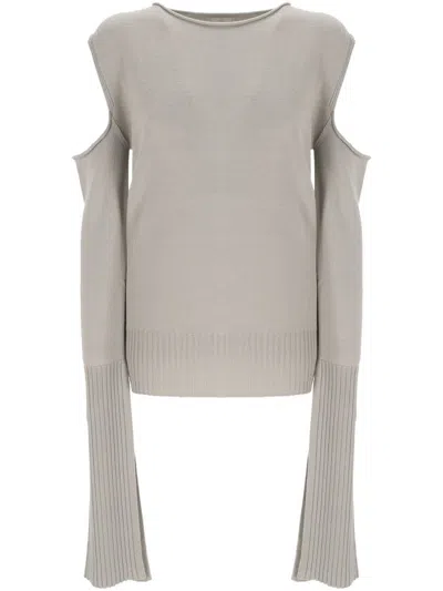 light grey virgin wool knitted construction cold-shoulder design roll neck long sleeves ribbed cuffs and hem slit cuffs unlined straight hem