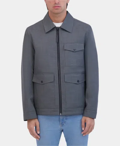 A utilitarian silhouette brings understated elegance to this seasonal layering piece. Large pockets at the chest add function while the slate gray exterior brings style. You'll love how this jacket elevates the look of any outfit no matter what the occasion. Point/camp collar Full zip front Contrast zipper Front pockets with snap closure Long sleeves Button cuffs 100% polyester Dry clean only Imported