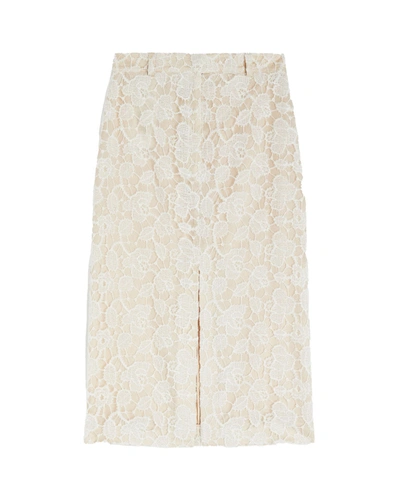 The Pencil Skirt in Embroidery by Rochas is a mid length pencil skirt crafted in a natural lace fabrication with belt loops and a vent. . .