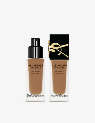 Parisian label Yves Saint Laurent introduces the improved All Hours foundation. Building on the success of the former, it boasts a more breathable formula that's designed to feel weightless on your skin while balancing and smoothing your complexion. Oh, and did we mention that it's also infused with hyaluronic acid? That means your skin is plumped and pumped with hydration throughout the day, too.Yves Saint Laurent All Hours foundationApplication: Glide All Hours foundation from the centre of the face outwards to unify the complexion. Using a dabbing gesture, build up coverage where needed.Skin type: Suitable for all skin types25mlFor hygiene reasons, this product cannot be exchanged or refunded, unless faulty.