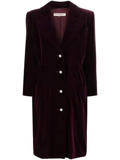 single-breasted velvet coat from Saint Laurent Pre-Owned featuring plum purple, velvet, wide notch lapels, front button fastening, shoulder pads, long sleeves, buttoned cuffs, two side slash pockets, straight hem, below-knee length and elasticated waist. Purchasing this item continues its narrative and reduces the environmental impact by avoiding the use of new resources needed to make the product from scratch, such as water, materials and electricity, and avoiding additional manufacturing impact.. Learn more about what makes a product Conscious on our Conscious Criteria page.
