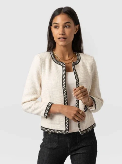 Buy the Rayner Jacket Bouclé. A beautiful, tailored jacket for a smart, sophisticated look. Designed in our London studios and handmade in Europe with a panel detailed boucle fabric and crest shank buttons in silver. From our Women's Jackets here at Saint and Sofia. Fit: True to Size. Semi-fitted, tailored shape. Soft, smooth hand feel. Model is 5'8" wearing size US 4. Main Fabric: 85% Organic Cotton 5% Birla Viscose. Lining: 100% Polyester. Trim: 90% Cotton 0% Metallised Fibres. Dry Clean Only. Handmade in Europe.