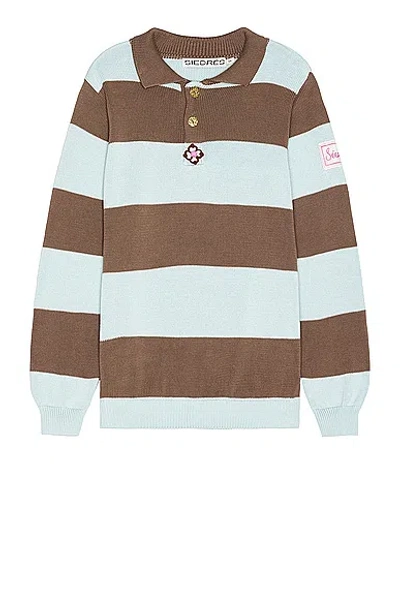 SIEDRES Ole Flower Crochet Detailed Striped Polo Sweater in Baby Blue,Brown 100% cotton. Made in Turkey. Machine wash. Partial front button closure. Crochet embellishment at front. Embroidered sleeve patch. Crochet knit fabric. SEDF-MK2. MSS24KW03BR. About the designer: