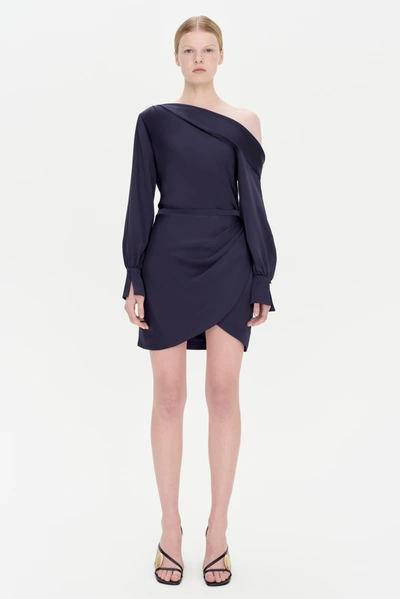 CORE COLLECTION. The Cameron Dress in Midnight. High sheen satin elegantly draped with romantic cold shoulder and buttoned cuffs. With a slimming, cinched waist and wrapped mini skirt hemline for powerfully feminine posturing