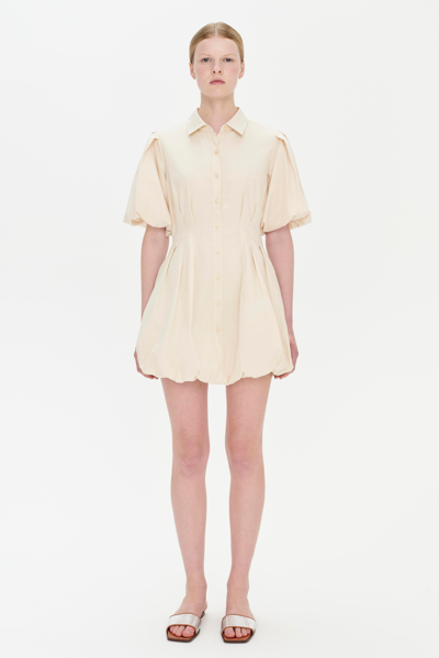CORE COLLECTION. Our Signature Cleo Mini Dress in Sand. The everyday ease of cotton poplin, crafted into a pleated mini dress with ballooned sleeves and a slimming, pintucked waist. A Simkhai signature.