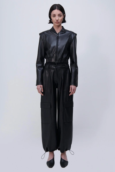 HOLIDAY 2023 READY-TO-WEAR. The Doreen Jacket in Black. Structured bomber silhouette engineered in supple vegan leather. Cropped sportif waist.
