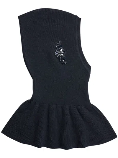 jet black merino wool-silk blend knitted construction crystal embellishment ruffled detailing pull-on style