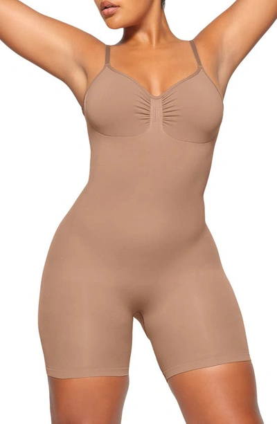 Who doesn't love a good bodysuit?Introducing the Seamless Sculpt Mid Thigh Bodysuit by SKIMS, a must-have addition to your shapewear collection. This solid bodysuit is crafted with a luxurious 82% Nylon, 18% Elastane for a seamless fit that enhances your natural shape. Designed with a flattering scoopneck and sleeveless silhouette, this bodysuit features a convenient pull-on closure. Easy to maintain, it's machine washable and can be tumble dried for added convenience.